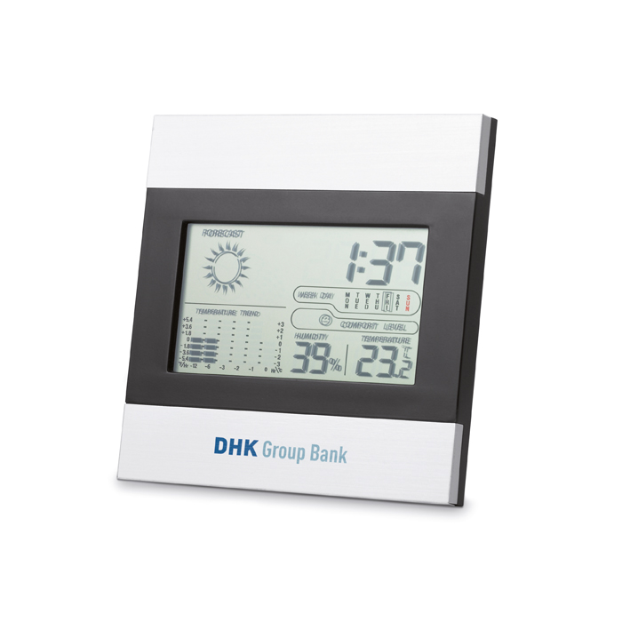 Eine elegante und multifunktionale Wetterstation, die eine präzise Uhr, ein zuverlässiges Thermometer und einen detaillierten Kalender kombiniert, alles in einem kompakten Design, das auf jedem Schreibtisch hervorsticht. Hergestellt aus Aluminium, integriert sie ein LCD-Display, auf dem auch Alarme programmiert werden können und auf dem der Wetterzustand sowie die Vorhersage angezeigt werden können. Sie funktioniert mit kleinen AAA-Batterien (nicht enthalten) und kann mit Ihrem Logo durch Tampondruck, Siebdruck oder Lasergravur sowohl auf der Ober- als auch auf der Unterseite personalisiert werden. Ein ideales Geschenk für Gemeinschaftsräume in Büros und Unternehmen oder in Wartezimmern von Krankenhäusern oder öffentlichen Verwaltungsgebäuden, zum Beispiel.