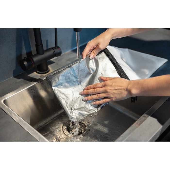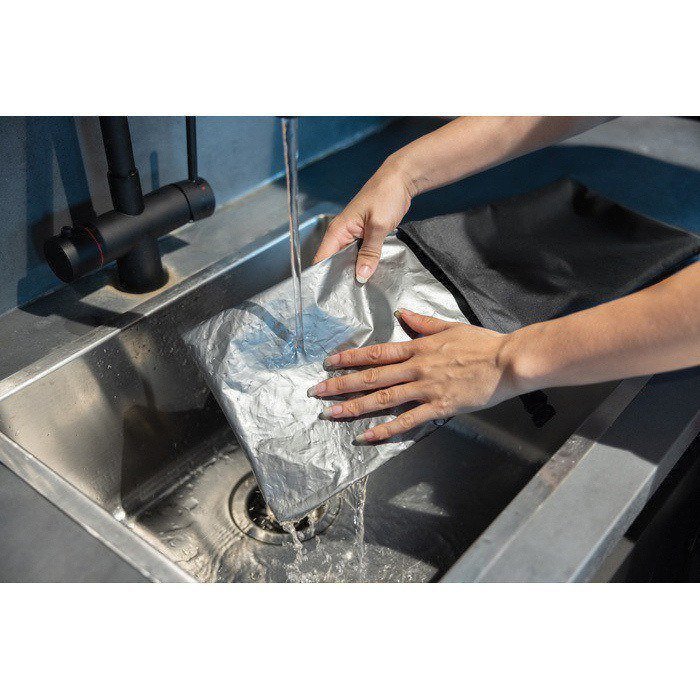 Faltbare Lunchbox aus recycelten PET-Flaschen, die eine nachhaltige Alternative zu Einwegbeuteln darstellt. Dank ihrer anpassbaren Größe und dem luftdichten Verschluss bleiben Lebensmittel länger frisch. Sie ist leicht zu reinigen, lässt sich kompakt zusammenfalten und bequem transportieren und eignet sich für Brot, Gemüse und Obst. Außerdem ist sie gefriergeeignet.