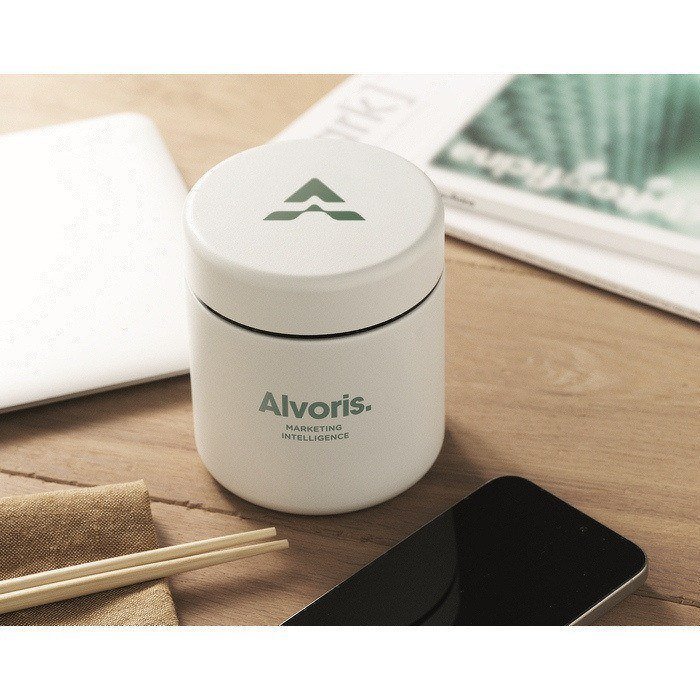 Doppelwandiger Edelstahl-Thermobehälter mit PP-Deckel, konzipiert für den täglichen Einsatz im Büro oder unterwegs. Er kombiniert 90% recycelten Edelstahl und 10% Edelstahl und hat ein handliches Format für Tasche oder Rucksack. Das Fassungsvermögen von 500 ml hilft dabei, Lebensmittel während des Tages griffbereit zu halten, mit praktischem Verschluss zur Vermeidung von Auslaufen. Geeignete Option für Willkommens-Kits, Firmenevents oder internes Merchandising.