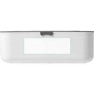 Brotdose (ca. 850 ml) aus Silikon und Kunststoff, trennbares Innenfach, mit farbigen Applikationen. Der Deckel kann als Handyhalter benutzt werden. Mikrowellen- und spülmaschinenfest.
