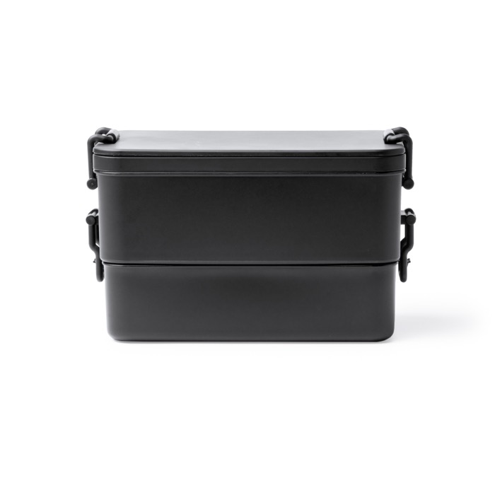Lunchbox aus Kunststoff mit Doppelkammer-System, um Lebensmittel zu trennen, ohne sie zu vermischen. Die beiden Behälter in unterschiedlichen Größen lassen sich übereinander stapeln oder ineinander gesteckt aufbewahren, um weniger Platz zu benötigen. Jedes Fach verfügt über einen Sicherheitsverschluss mit seitlichen Schnallen, ausgelegt für den täglichen Transport. Im Deckel ist ein Besteckset integriert, das mit einer Clip-Halterung befestigt ist, sodass Sie essen können, ohne auf das Büro oder die Veranstaltung angewiesen zu sein. Eine praktische Lösung für interne Aktionen, Schulungen oder Geschenke mit Logo.