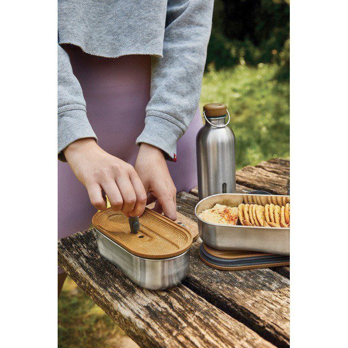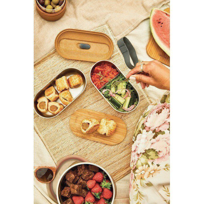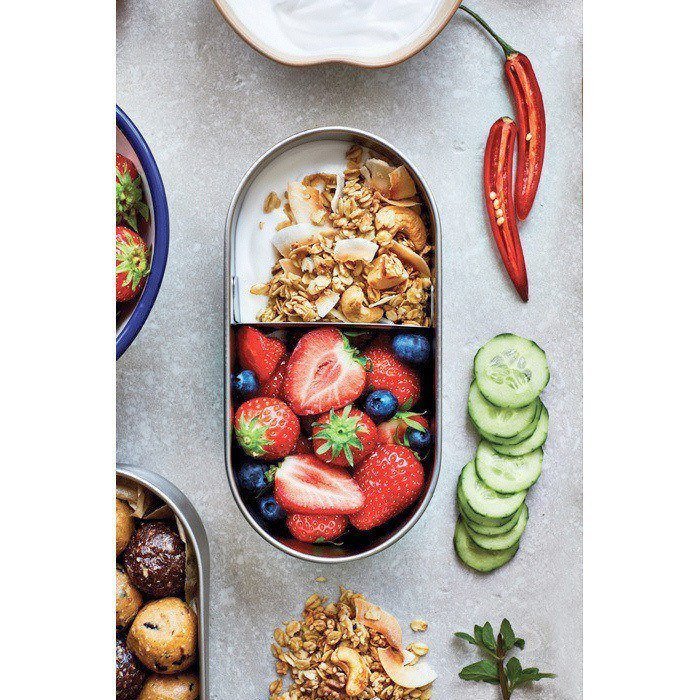 Set aus Edelstahlbehältern mit einem Gesamtvolumen von 1000ml. Es ist für schnelle Mahlzeiten im Büro oder unterwegs gedacht. Es umfasst zwei Behälter à 500ml. 100% luftdicht. Dazu gibt es einen verschiebbaren Trenner aus Edelstahl, damit Zutaten einfach getrennt bleiben. Der Bambusdeckel dient zugleich als Schneidebrett und bewahrt eine integrierte Gabel auf, damit Sie überall essen können. Entwickelt zusammen mit Sara Kiyo Popowa (Bento Power). Es enthält fünf exklusive Rezepte. Nützlich als Unternehmensgeschenk für Teams, Veranstaltungen oder Wellness-Kampagnen.