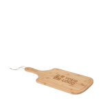 Servierbrett aus Bambus mit Saftrille. Aufhänger aus Jute.
