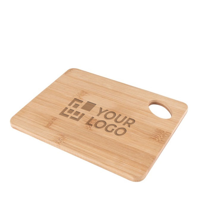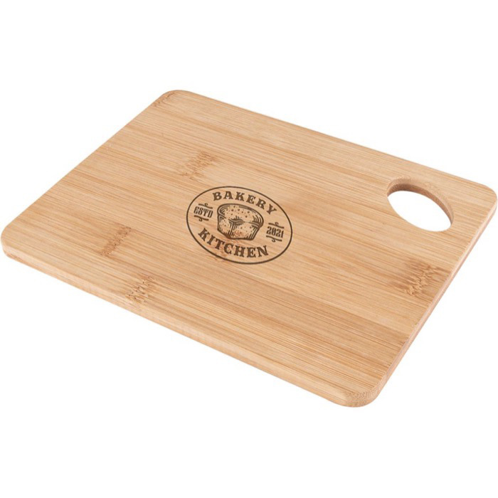 Küchenbrett aus Bambus mit praktischem ausgestanztem Loch, das das Greifen und Aufhängen in der Küche erleichtert. Die Oberfläche eignet sich für tägliche Aufgaben wie Schneiden, Hacken oder das Anrichten von Lebensmitteln und trägt dazu bei, den Arbeitsplatz ordentlich zu halten. Das schlichte Design passt in professionelle Umgebungen – von Büros mit Essbereich bis hin zu Eventflächen mit Catering. Eine attraktive Option zur Personalisierung mit Logo für Willkommensaktionen, Messen oder Kundengeschenke.