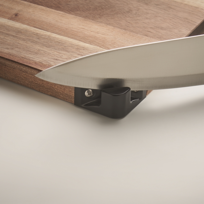 Schneidebrett aus Akazienholz mit Messerschärfer als Merchandising