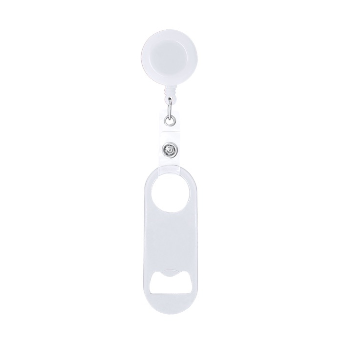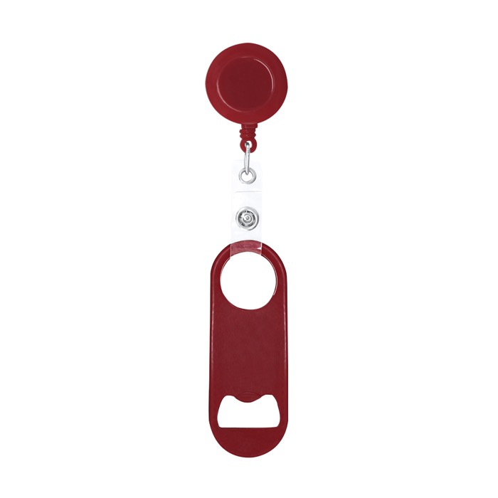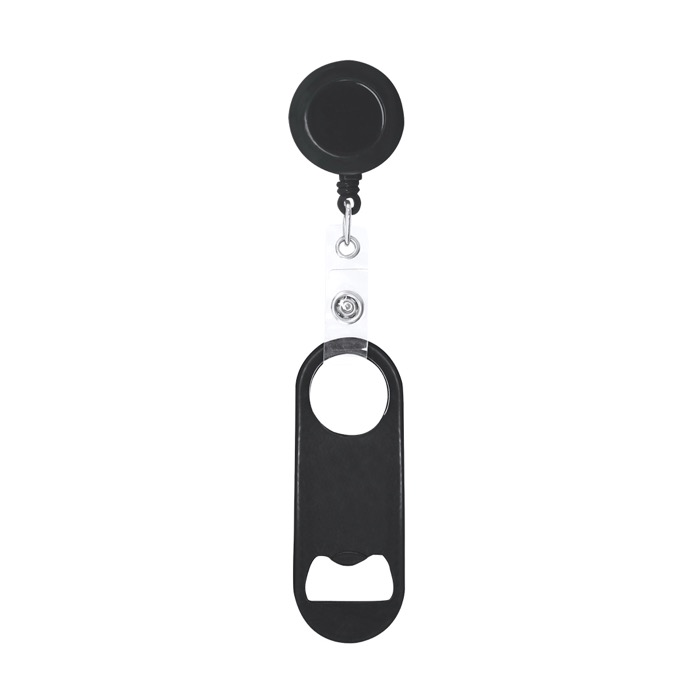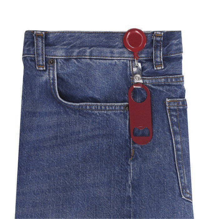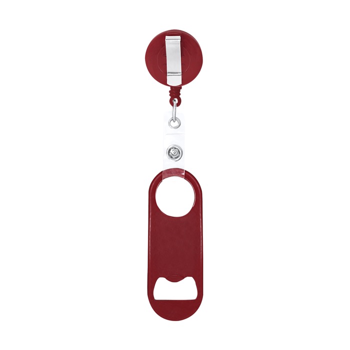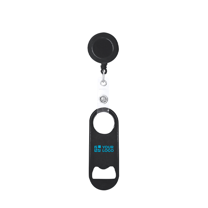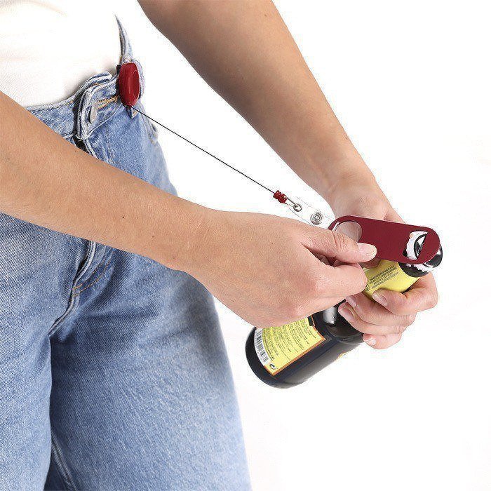 Flaschenöffner aus Stahl mit glänzender Metalloberfläche, entwickelt für den täglichen Einsatz bei Veranstaltungen und in der Gastronomie. An einem Ende befindet sich ein Flaschenöffner, am gegenüberliegenden Ende eine runde Öffnung, die per Druckverschluss mit einem ausziehbaren 65cm-Halter mit Clip verbunden ist. So können Sie ihn angeclipst tragen, um Verluste zu reduzieren und die Arbeit an der Bar oder an Servicepunkten zu beschleunigen. Der abnehmbare Verschluss erleichtert es, nur den Öffner zu verwenden oder ihn bei Unternehmensaktionen separat an ein Umhängeband zu befestigen.