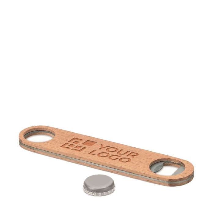 Elegantes Modell eines Flaschenöffners für Firmen und Werbung aus Holz und Metall, mit einer großen Druckfläche, um das Logo zu platzieren.
