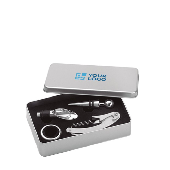 Ein komplettes Weinset, das Eleganz und Funktionalität vereint. Dieses Set enthält 4 Accessoires, mit denen Sie Wein wie ein Profi öffnen, servieren und lagern können: einen Korkenzieher, einen Stopfen, einen Dosierer und einen Tropfring. Das gesamte Set wird in einer Metallbox geliefert, die ebenso wie die darin enthaltenen Utensilien aus widerstandsfähigem Edelstahl gefertigt ist. Sowohl die Box als auch der Korkenzieher können mit Ihrem Logo personalisiert werden, sodass Ihre Marke bei jedem Öffnen einer neuen Flasche im Mittelpunkt steht. Ein ideales Geschenk, um Ihre Marketingstrategie auf eine neue Ebene zu heben.