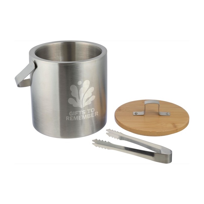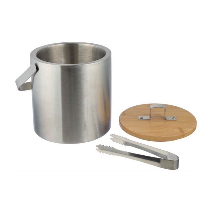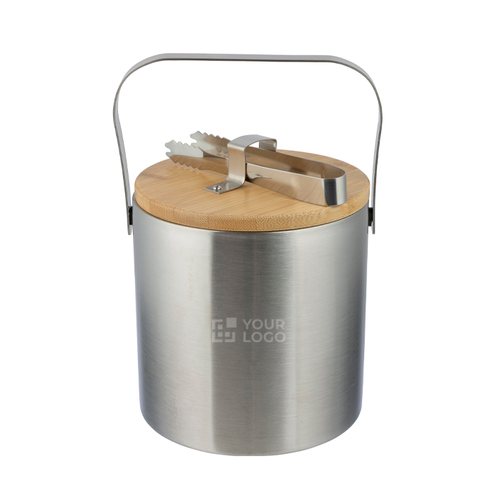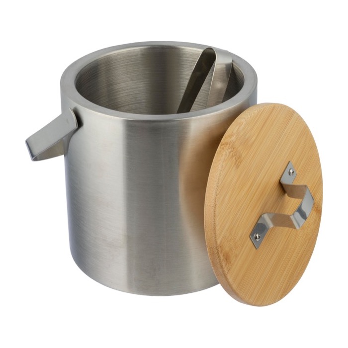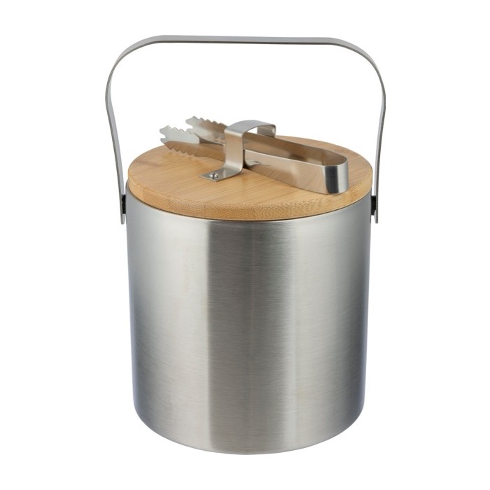Doppelwandige Edelstahl-Eisbox, 1200 ml, mit Bambusdeckel, Edelstahlgriff und Eiszange. Innen 304, außen 201. Geliefert in brauner Kartonbox