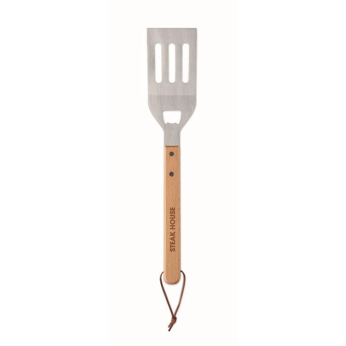 BBQ-Spatel aus Edelstahl mit Buchenholzgriff, entwickelt zum Wenden und Handhaben von Fleisch und Gemüse auf dem Grill mit angenehmem Griff. Mit integriertem Flaschenöffner, damit er beim Servieren stets zur Hand ist. Die PU-Aufhängeschnur ermöglicht das Aufhängen zur Aufbewahrung und hält den Küchenbereich ordentlich. Eine praktische Option für Hospitality-Aktionen, Küchensets oder Firmengeschenke im Zusammenhang mit gastronomischen Events.