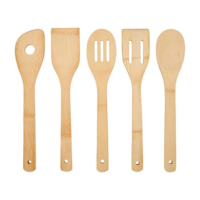 Set aus Küchenutensilien aus Bambus mit passendem Ständer, ausgelegt für den praktischen und ordentlichen täglichen Gebrauch. Enthält Löffel, Schaumlöffel, Pfannenwender, Schlitzwender und Schlitzspatel, alle mit einer Stärke von 0,8 cm für einen sicheren Griff und gute Stabilität bei der Handhabung. Durch ihre materialschonenden Eigenschaften helfen sie, Pfannen und Töpfe bei typischen Aufgaben wie Umrühren, Servieren oder Anbraten zu schützen. Eine passende Option zur Personalisierung mit Logo für Markenaktionen rund um Lebensmittel, Einzelhandel oder kulinarische Veranstaltungen.