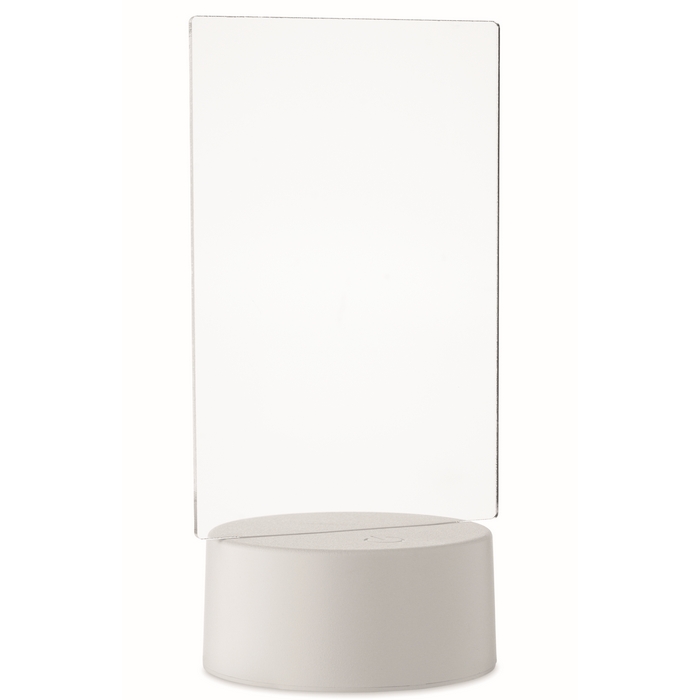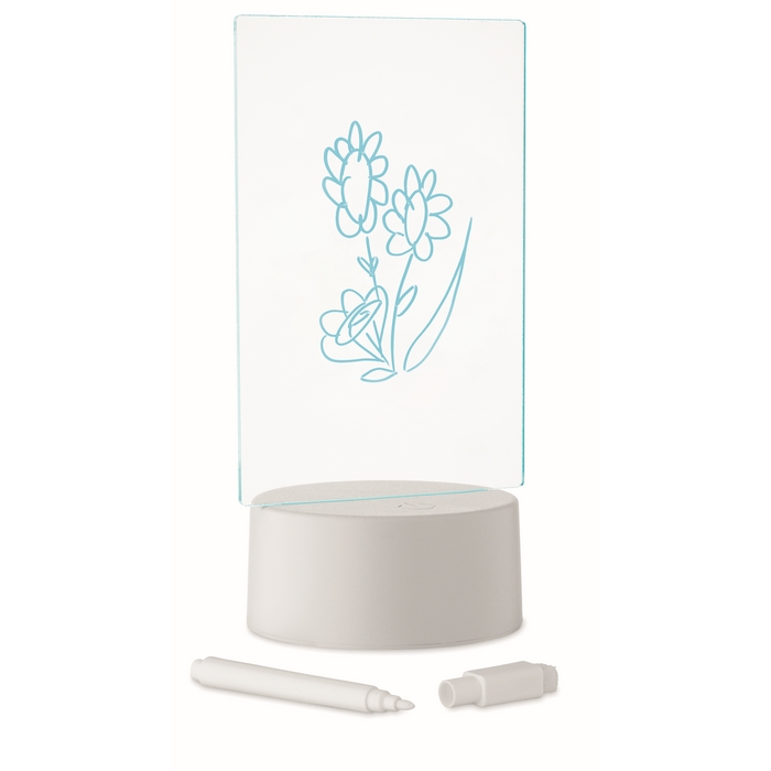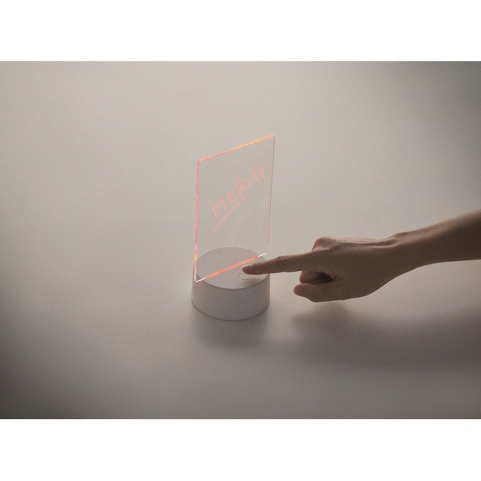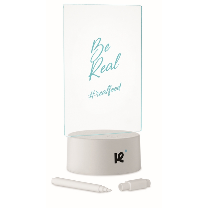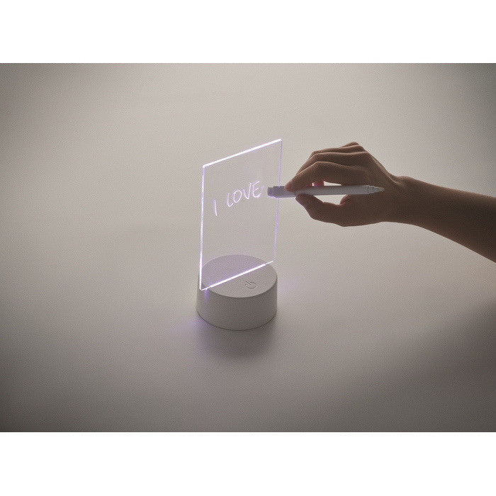 LED-Notiztafel aus Acryl mit Aluminiumbasis, zum schnellen Schreiben und Löschen von Nachrichten. Enthält einen abwischbaren weißen Marker und bietet Farbwechsel-Beleuchtung, damit Notizen in Umgebungen mit wenig Licht besser sichtbar sind. Funktioniert mit 3 AAA-Batterien (Standard-Batterieformat), nicht enthalten, was eine kabellose Nutzung auf Tresen oder Tischen erleichtert. Praktische Option für interne Beschilderung, Empfangsbereiche, Promotionen am Point of Sale oder Firmenevents.