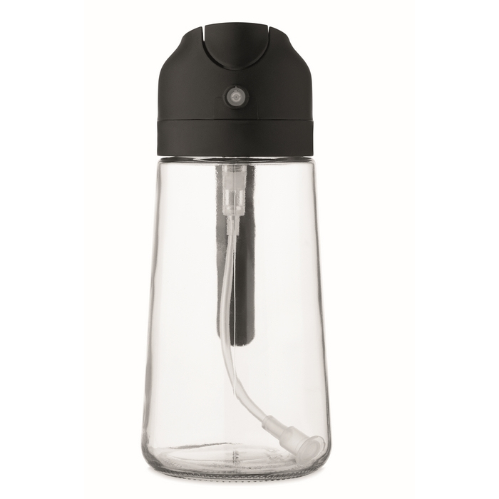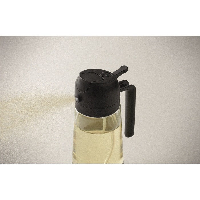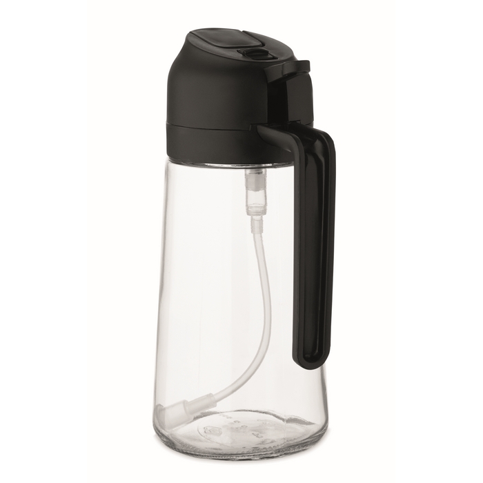 2-in-1 Ölspender und -Zerstäuber aus Glas mit PP-Deckel und PE-Strohhalm. Mit einem Fassungsvermögen von 450 ml, um die Dosierung in der Küche zu kontrollieren und eine saubere Anwendung bei Salaten, auf Plancha-Grills oder beim Backen zu erleichtern. Das transparente Design hilft, den Füllstand auf einen Blick zu erkennen, und der Deckel schützt das Auslasssystem, wenn es nicht benutzt wird. Praktische Option für Firmengeschenkkörbe, Willkommenssets oder Markenaktionen rund um Lebensmittel.