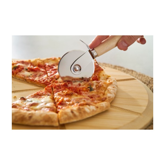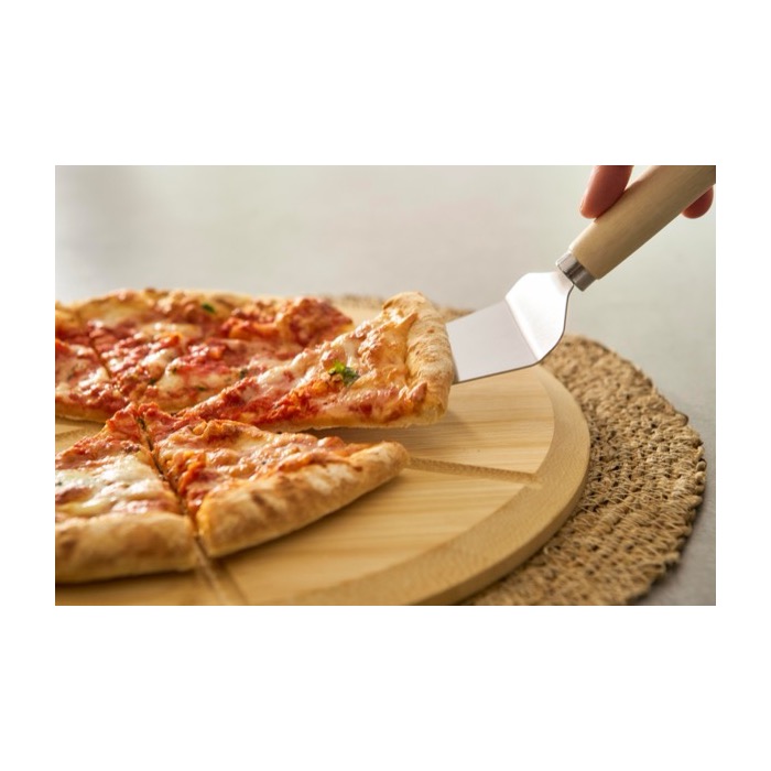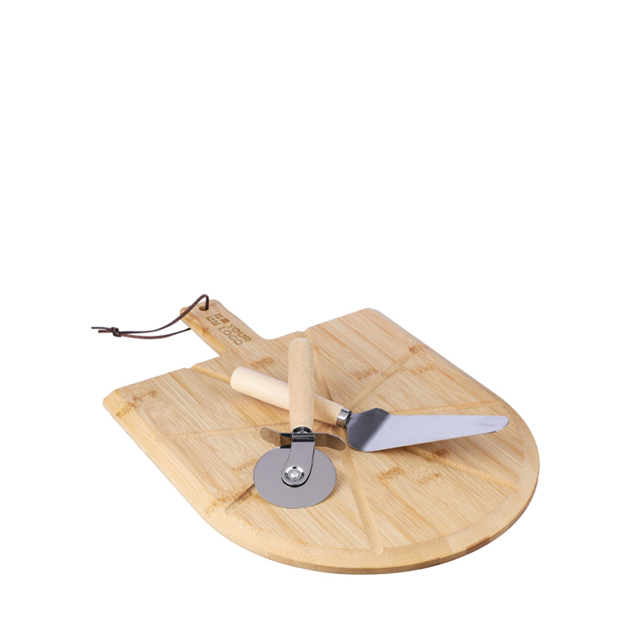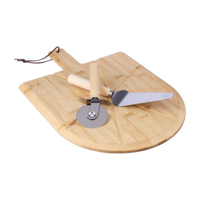 Pizzabrett aus Bambus mit Griff, Pizzaschneider und Spatel. Ein Set, das deine Marke in die Haushalte bringt und mit positiven Momenten verbindet.