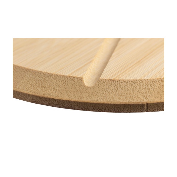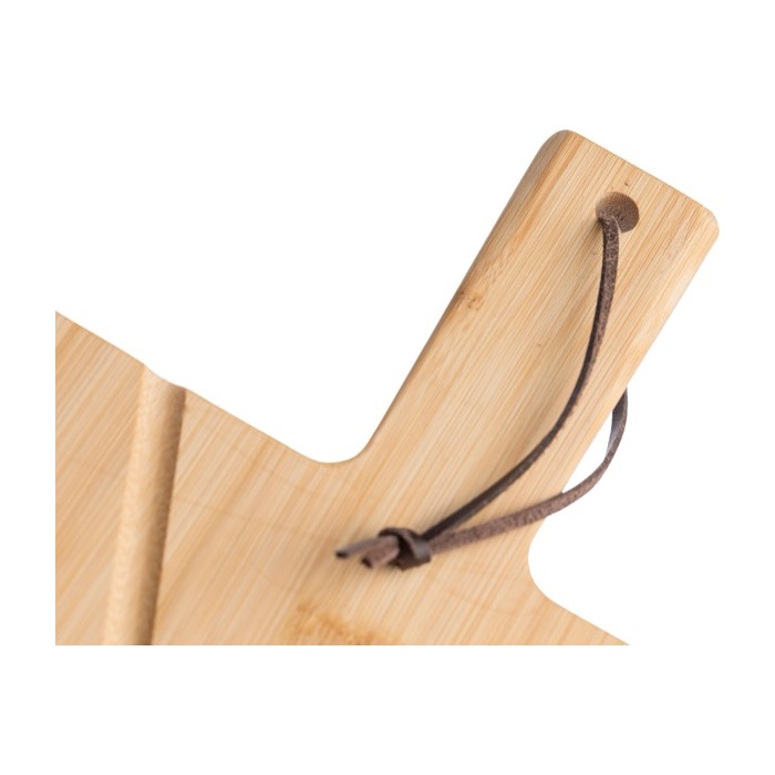 Pizzabrett aus Bambus mit Griff und Schneideleitsystem für einfaches Servieren. Inklusive Pizzaschneider aus Edelstahl und Buche sowie Spatel. Mit PU-Kordel am Griff zum Aufhängen. 3-teiliges Set (Brett, Messer, Pizzaschneider). Geliefert in brauner Kartonbox