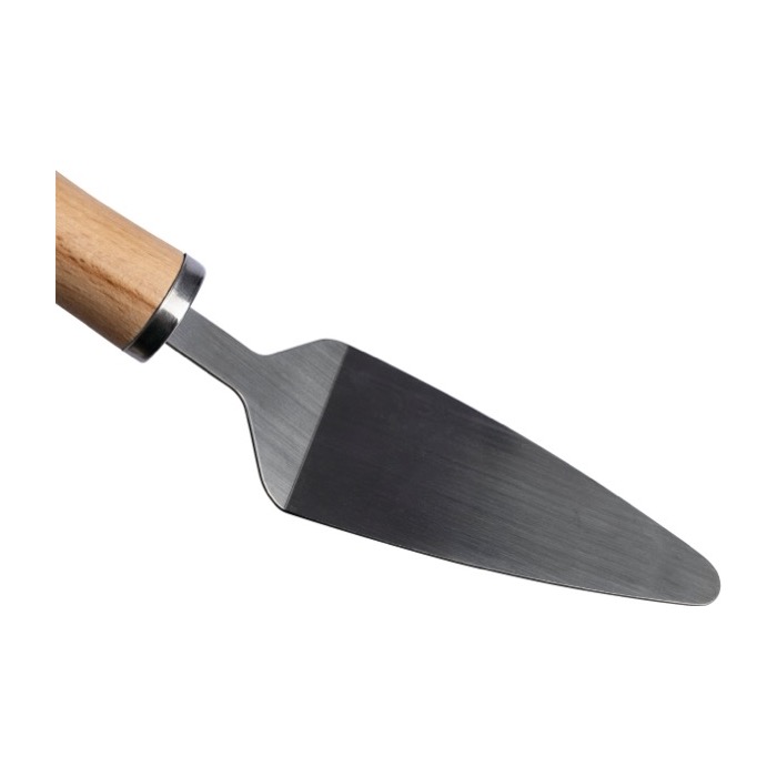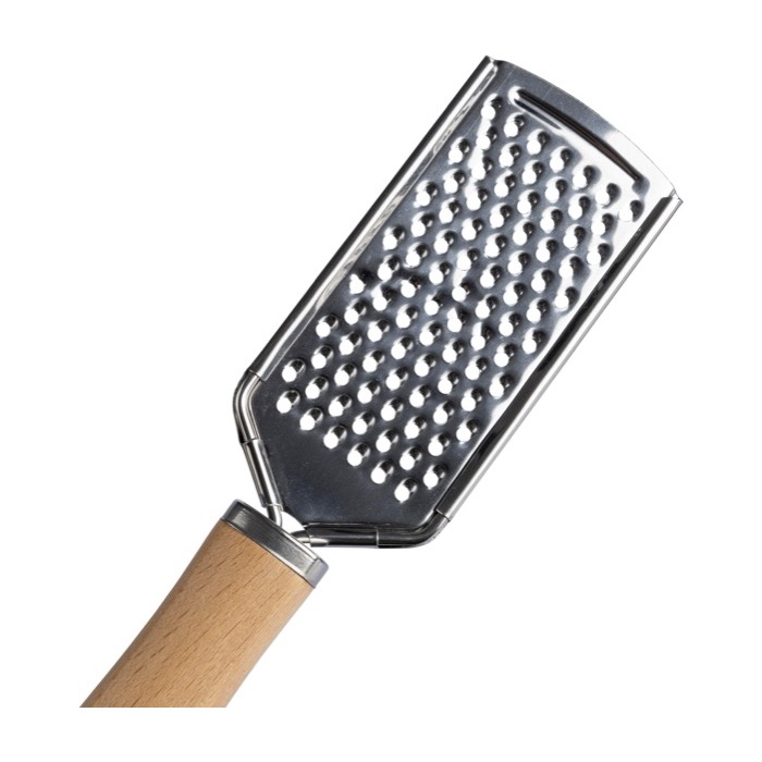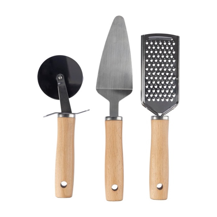 Küchenutensilien-Set mit Reibe aus Edelstahl, Tortenheber und Pizzaschneider, jeweils mit Holzgriff. Nicht spülmaschinengeeignet. Geliefert im Baumwollbeutel mit Kordelzug