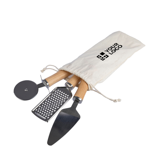 Reibe, Tortenheber und Pizzaschneider in Baumwollbeutel