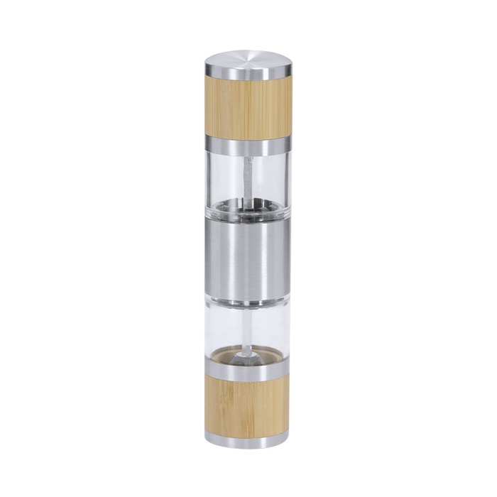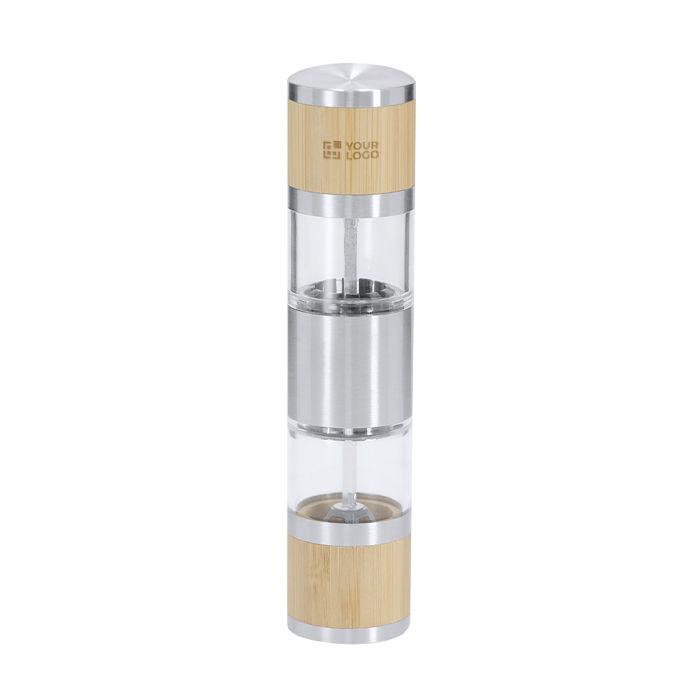 Manuelle Gewürzmühle für Salz und Pfeffer aus Bambus und Edelstahl, ausgelegt für den täglichen Einsatz in Küche oder Gastraum. Sie verfügt über zwei getrennte Kammern, eine für jedes Gewürz, und erleichtert den Wechsel des Geschmacks, ohne zwei separate Mühlen zu benötigen. Jede Kammer enthält ein internes Keramikmahlwerk mit manueller Einstellung des Mahlgrades, sodass Sie je nach Gericht zwischen feiner oder gröberer Mahlung wählen können. Das seitliche Sichtfenster ermöglicht es Ihnen, den Füllstand auf einen Blick zu kontrollieren. Eine praktische Option für Unternehmensgeschenke in der Gastronomie oder für Markenaktionen im Lebensmittelbereich.