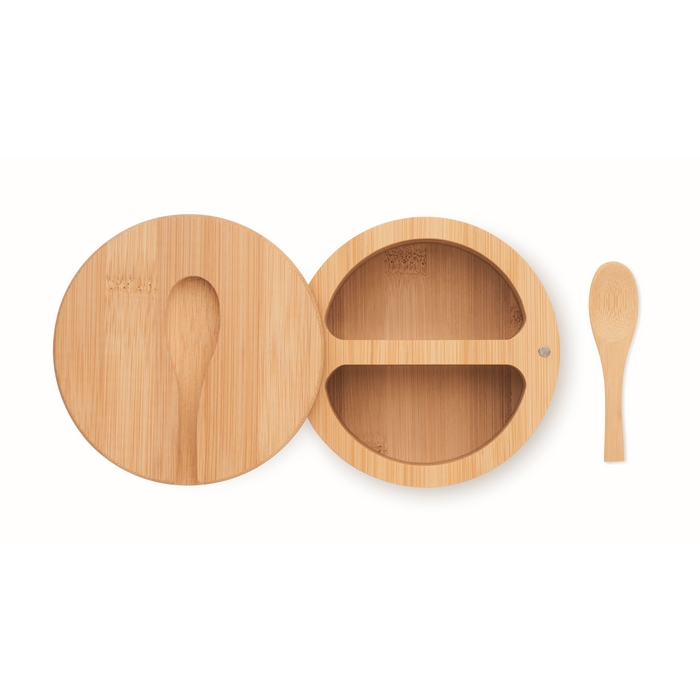 Salz- und Pfefferdose aus Bambus mit integriertem Servierlöffel. Zwei Fächer. Deckel mit Drehverschluss. Bambus ist ein natürliches Produkt, es kann daher zu leichten Abweichungen in Farbe, Dekor und Maßen kommen.