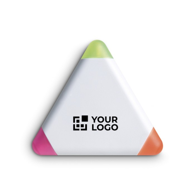 Dieser dreieckige Marker ist ein kleines, aber sehr nützliches Werbegeschenk, das durch sein besonderes Design sofort ins Auge fällt. Mit drei fluoreszierenden Spitzen in Gelb, Fuchsia und Orange hilft er dabei, Notizen zu strukturieren, wichtige Inhalte hervorzuheben und Informationen übersichtlich sichtbar zu machen. Das Gehäuse besteht aus widerstandsfähigem ABS-Kunststoff und ist leicht genug, um ihn problemlos im Etui oder im Rucksack mitzunehmen. Durch die Vollfarbpersonalisierung können Sie die gesamte Fläche optimal nutzen, um Ihre Marke auf originelle und farbenfrohe Weise zu präsentieren. Ideal für Schulen, Events, Workshops oder Messen.