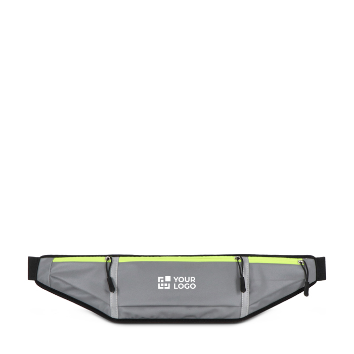 Reflektierende Bauchtasche aus Synthetikmaterial mit Reißverschluss, geeignet für sportliche Aktivitäten mit erhöhter Sichtbarkeit. Sie verfügt über ein Hauptfach und zwei seitliche Taschen für Telefon, Schlüssel oder Zubehör. Die Mesh-Rückseite verbessert die Belüftung und reduziert Feuchtigkeit bei Bewegung. Der elastische Hüftgurt sorgt für einen sicheren Sitz. Eine praktische Option für Laufevents, HR-Aktionen und Sport-Merchandising.