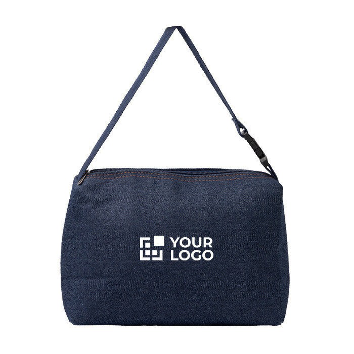 Kühltasche aus recyceltem Denim mit Isolierinnenraum, entwickelt, um Lebensmittel und Getränke während des Tages auf einer stabilen Temperatur zu halten. Das Hauptfach wird mit einem farblich passenden Reißverschluss geschlossen und verfügt über einen Metall-Zipper, der das Öffnen auch unterwegs erleichtert. Der Tragegriff mit Schnalle lässt sich verstellen und sorgt je nach Einsatz für einen bequemen Transport. Durch das Unisex-Format und die hochwertige Anmutung eignet sie sich für Willkommensaktionen, interne Veranstaltungen oder Markenkampagnen für Teams und Kundschaft.