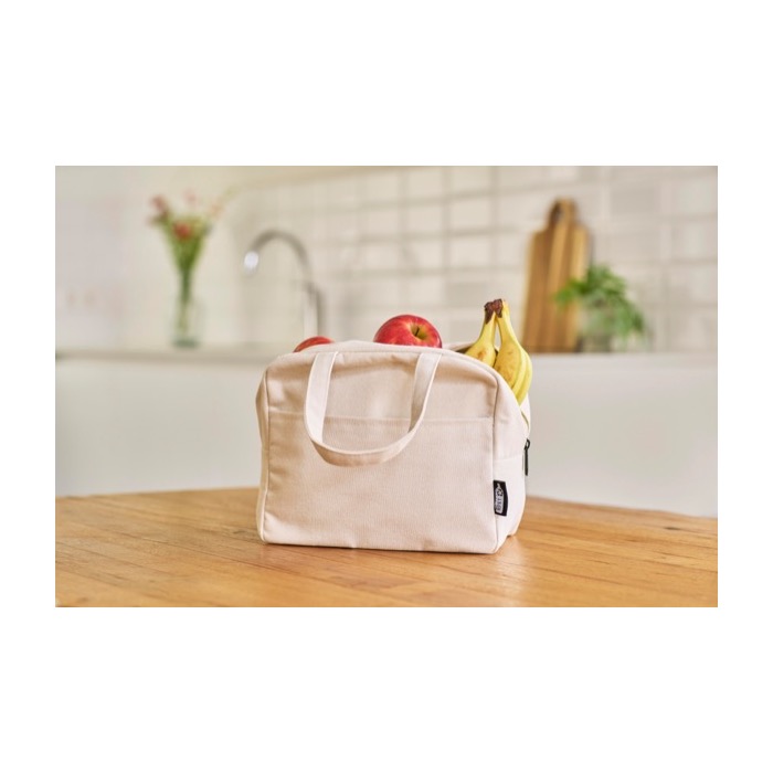 Kühltasche aus recyceltem Poly-Baumwollgewebe (330 g/m²), Innenfutter Polyester 210D, Aluminium-Isoliereinlage. Kapazität: 8 l, Traglast: 5 kg, mit Recyclingetikett. Auch als Kosmetiktasche nutzbar