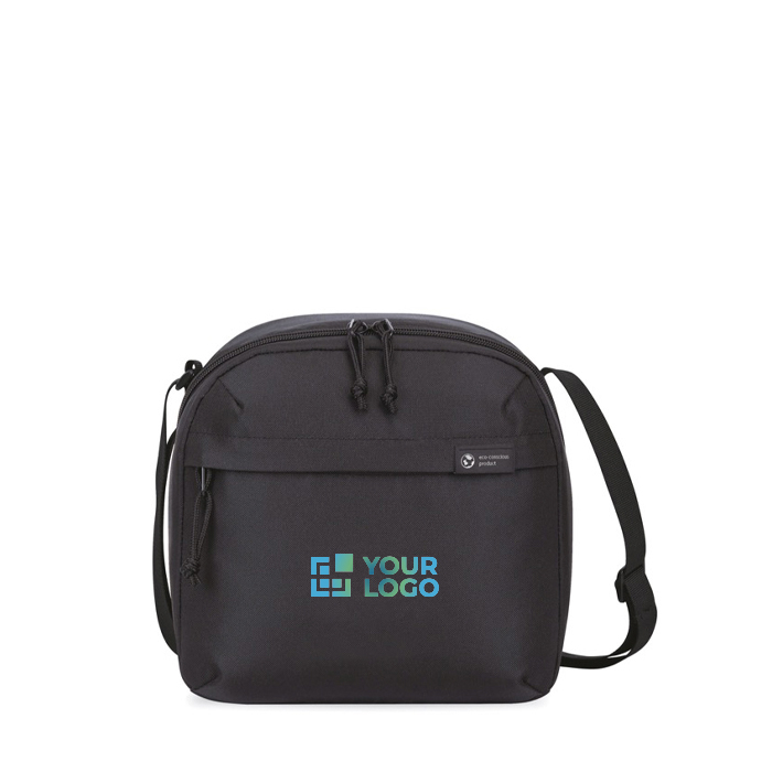 Kühlbox für Lunchpakete aus recyceltem Stoff und Riemen aus Plastikflaschen. Mit Fronttasche mit Reißverschluss, isoliertem Hauptfach mit schräger Öffnung und doppeltem Reißverschluss sowie verstellbarem, beidseitig tragbaren Schultergurt für komfortablen Gebrauch. Fassungsvermögen: ca. 9 Dosen.