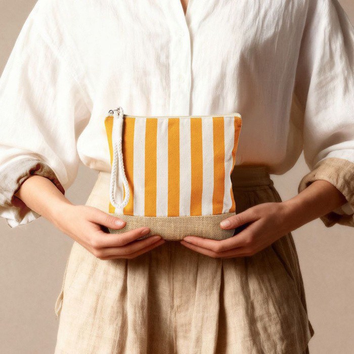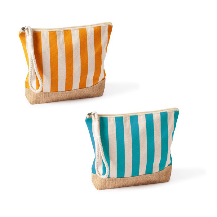 Gestreifter Kulturbeutel aus Baumwolle und Jute mit Kordel am Zipper