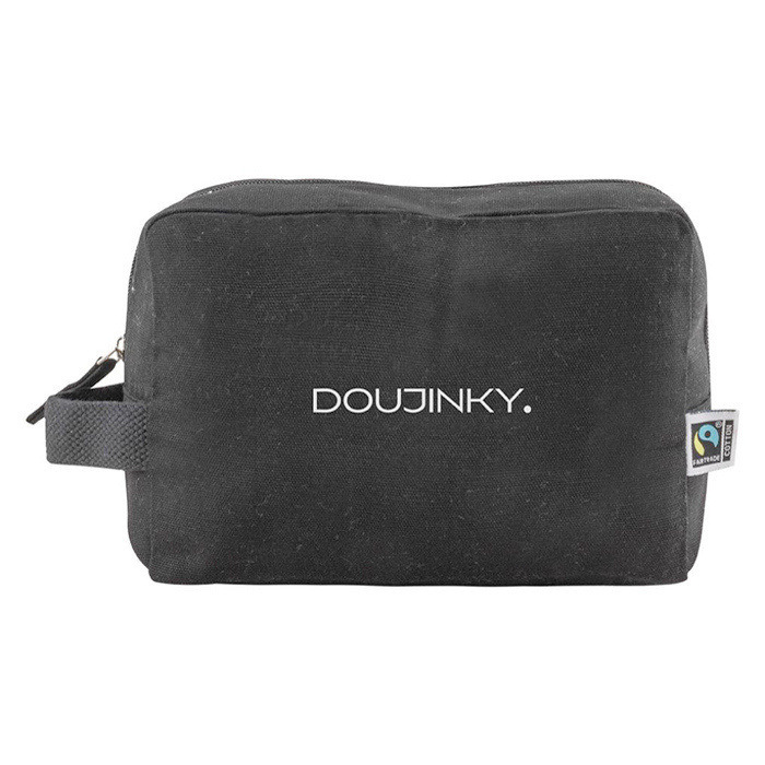 Kulturbeutel aus schwarzer Fairtrade-Baumwolle. Mit Siegel und Garantie von Fairtrade.