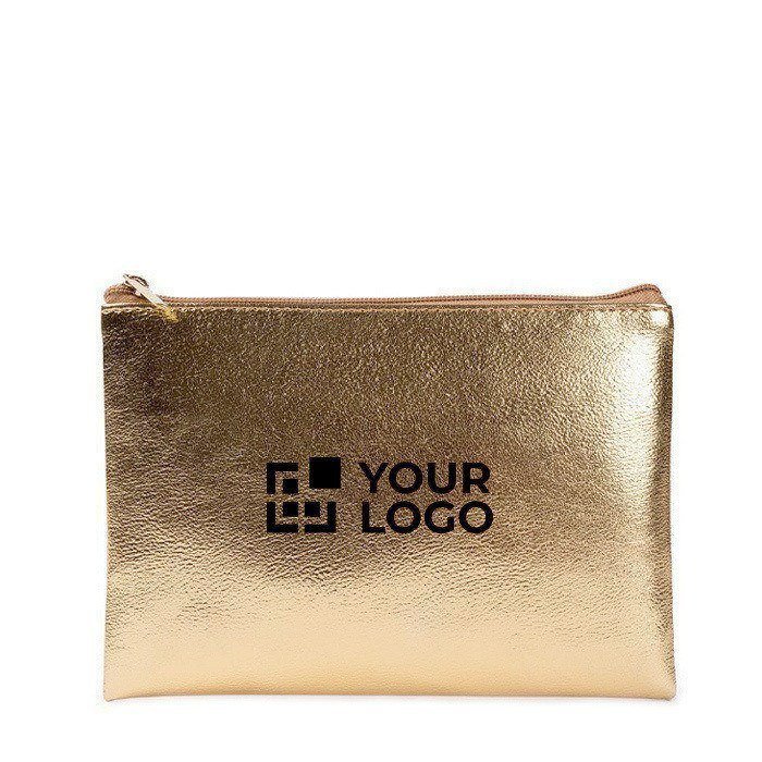 Flache Kulturtasche im goldenen PU-Finish, 350 g/m², die alle Blicke auf sich zieht und Ihrem Unternehmen zusätzliche Sichtbarkeit verschafft.