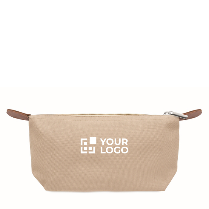 Kulturbeutel aus RPET-Polyester 600D mit Reißverschluss oben und braunem PU-Detail für ein strapazierfähiges, leicht zu reinigendes Finish. Kompaktes Format zum Transport von Hygieneartikeln, Reiseaccessoires oder kleinem Büromaterial. Der obere Reißverschluss ermöglicht schnellen Zugriff und schützt den Inhalt während des Transports. Das 600D-Gewebe bietet gute Haltbarkeit im täglichen Gebrauch. Praktische Option für Willkommenspakete, Corporate-Reisekits oder Merchandising-Aktionen bei Events.