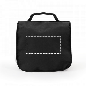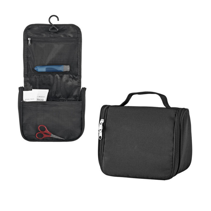 Es handelt sich um eine Kulturtasche als Werbemittel mit viel Platz und mehreren Fächern, die auch mit dem Logo des Unternehmens bedruckt werden kann, um es Kunden zu schenken.