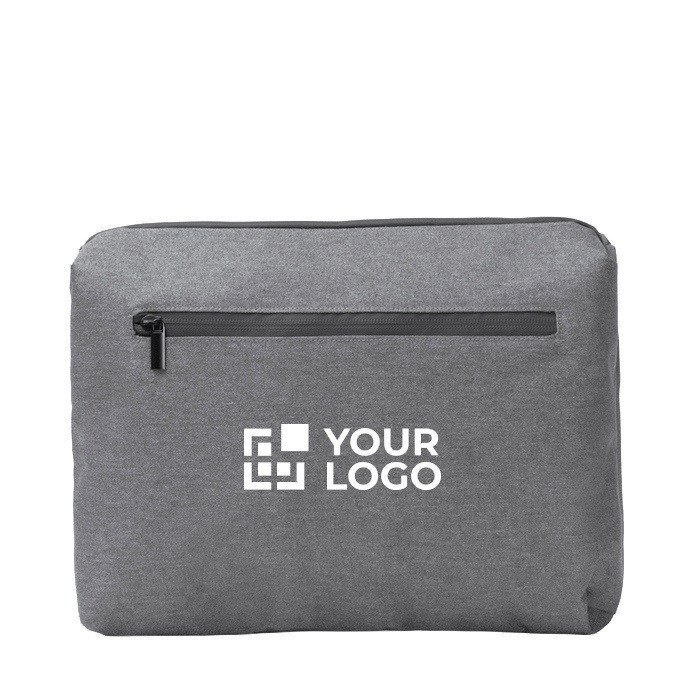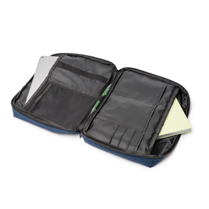 Laptophülle aus recyceltem Kunststoff mit 300D-Finish und Kunststoffdetails, geeignet für Geräte bis 12". Sie verfügt über zwei Innenfächer und eine vollständige Öffnung, damit Sie Ihren Alltag ohne Zeitverlust organisieren. Reißverschlüsse und Gewebe sind wasserabweisend, ideal auf Wegen und in der Stadt. Enthält zusätzliche mittelgroße und kleine Fächer, ein Netzfach mit Reißverschluss sowie elastische Schlaufen zum Fixieren von Zubehör. Zusätzlich gibt es eine große Außentasche mit Verschluss. Praktische Option für Schulungen, Veranstaltungen und den Willkommensgruß im Unternehmen.