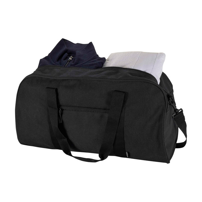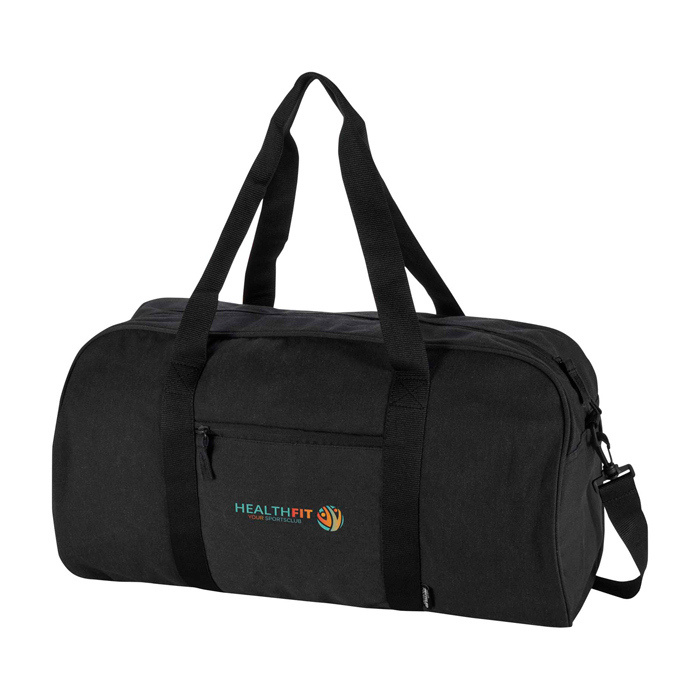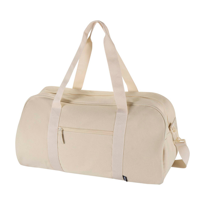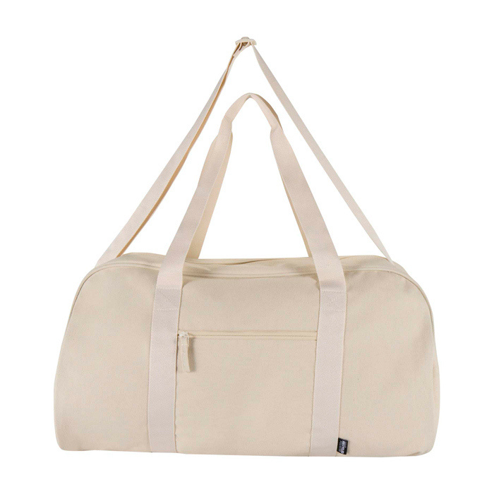 Wasserabweisende Reisetasche aus recyceltem Canvas mit GRS-Zertifikat (Global Recycled Standard), ausgelegt für den intensiven täglichen Einsatz. Sie verfügt über ein geräumiges Hauptfach für Kleidung oder Arbeitsmaterial sowie ein Frontfach mit Reißverschluss zur Aufbewahrung von Dingen, die schnell griffbereit sein sollen. Die weichen Tragegriffe erleichtern das Tragen in der Hand, und die verstellbaren, abnehmbaren Schultergurte ermöglichen den Wechsel zwischen Tragen über der Schulter oder als Umhängetasche. Empfehlenswert zur Ausstattung von Teams, für Markenaktionen oder für Firmenveranstaltungen.