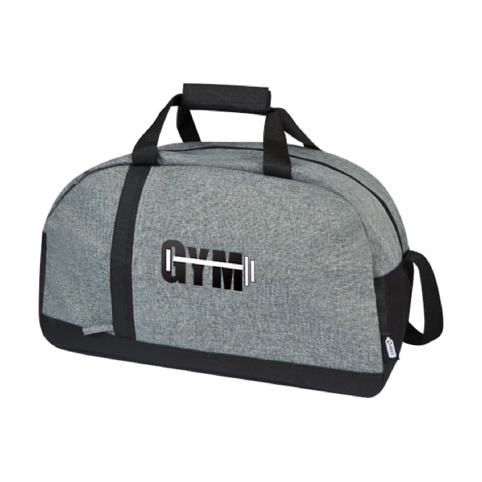 Sporttasche bedruckt in zwei Farben mit Tragegriffen und verstellbarem Schultergurt, ein nachhaltigeres Modell, da es aus recyceltem Polyester besteht.
