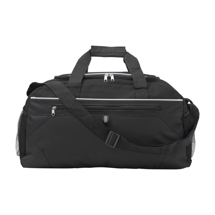 Sporttasche aus Polyester (600D) mit RV-Haupt- und Frontfach, seitlichen Netzfächern, verstellbarem Schultergurt und Tragegriffen.