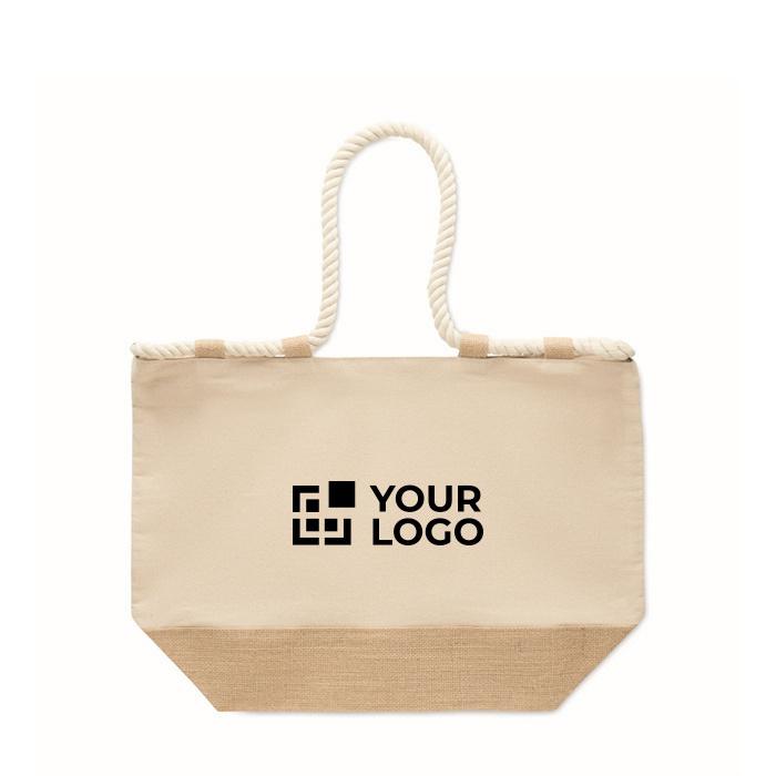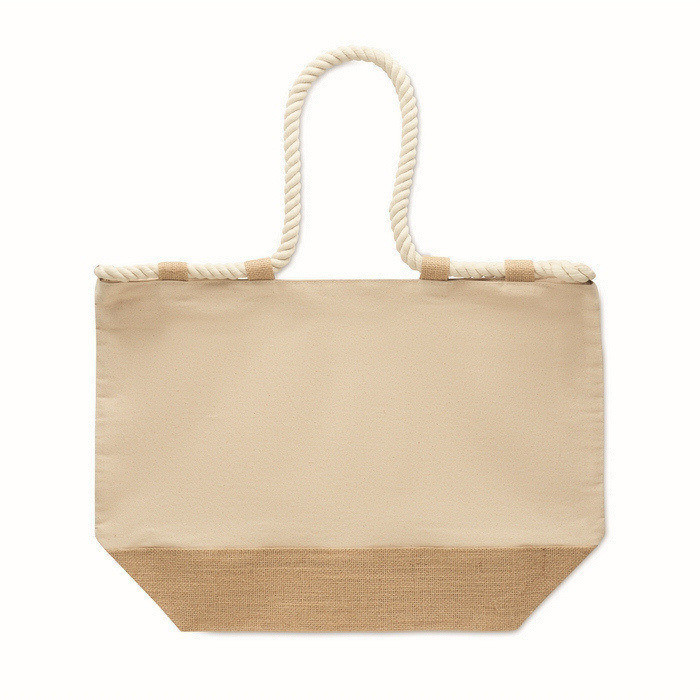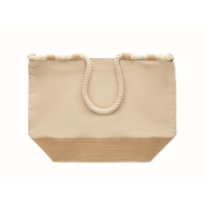 Strandtasche aus 280 g/m² Baumwoll-Canvas in Kombination mit Jute, ausgelegt für intensive Nutzung im Sommer oder bei Outdoor-Events. Mit Seilgriffen für einen angenehmen Halt und Reißverschluss, um den Inhalt beim Transport zu schützen. Der mit Jute beschichtete Boden sorgt für höhere Standfestigkeit und hilft, die Form zu bewahren. Enthält 10 Juteschlaufen als praktisches und dekoratives Detail. Eine nützliche Option für Willkommenspakete, Saisonkampagnen oder Corporate Merchandising.