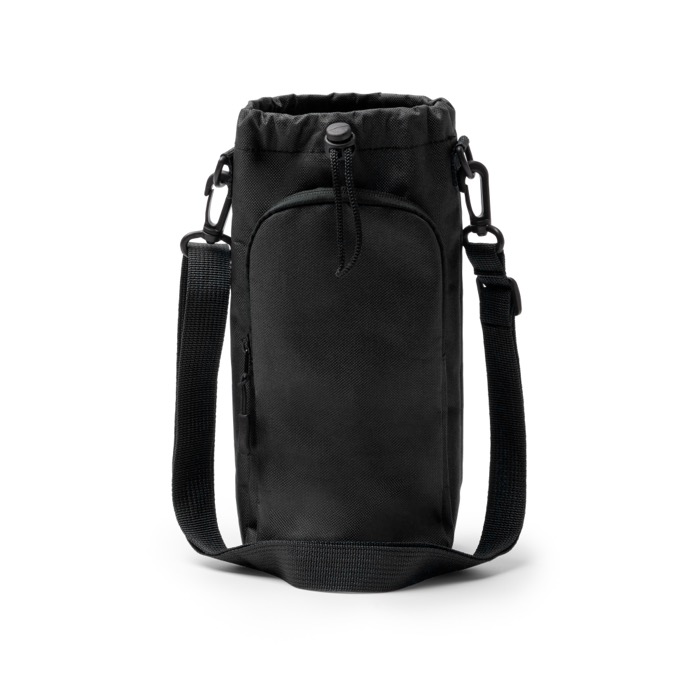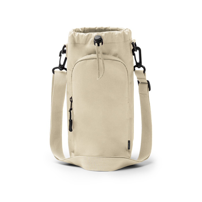 Flaschentragetasche aus recyceltem Kunststoff 600D, entwickelt für den komfortablen Transport von Behältern bis 2 L. Sie verfügt über einen Kordelzug mit Versteller zum sicheren Fixieren des Inhalts sowie über ein weit zu öffnendes Außenfach mit Reißverschluss, ideal für Schlüssel, Mobiltelefon oder Ausweise. Der verstellbare Gurt mit Verstärkungen verbessert den Tragekomfort und lässt sich dank integriertem Karabiner abnehmen. Das Innenfutter erhöht die Widerstandsfähigkeit im täglichen Einsatz. Eine praktische Option für Markenaktionen bei Veranstaltungen, für Vertriebsteams oder für Unternehmensaktivitäten.