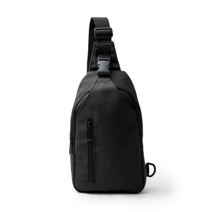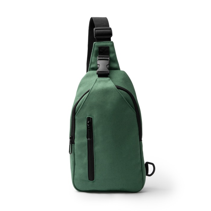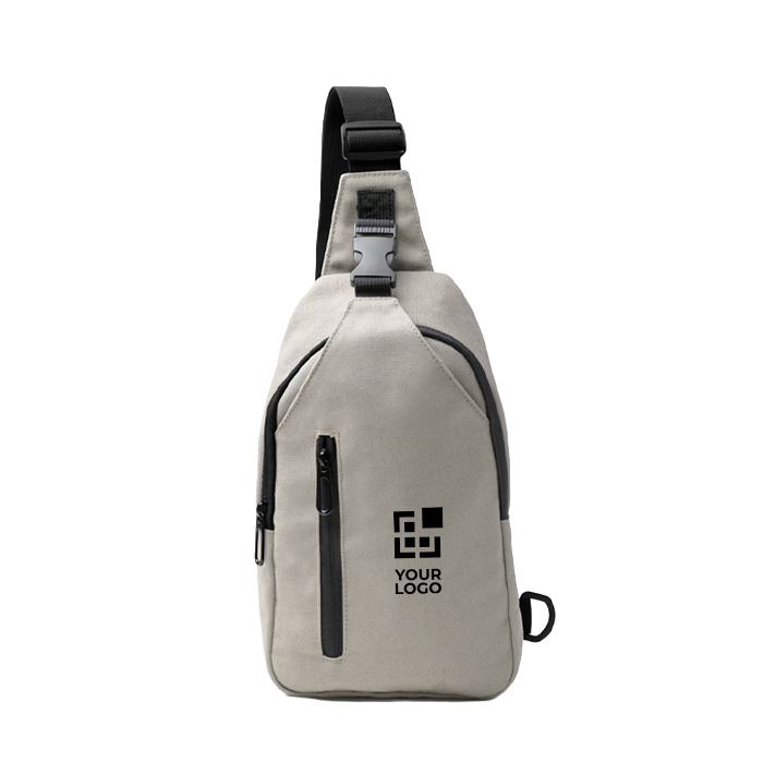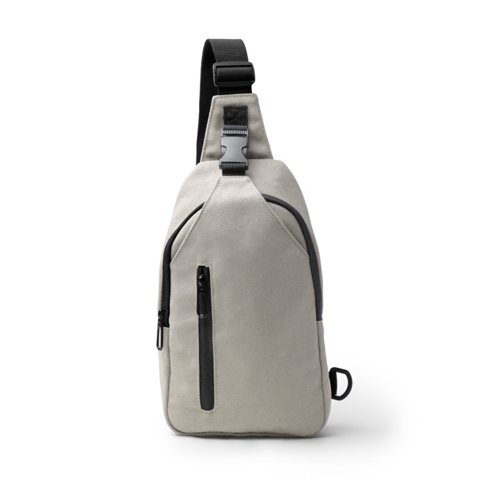 Umhängetasche aus recyceltem Baumwoll-Canvas, konzipiert für den Alltag unterwegs. Sie verfügt über einen verstellbaren Gurt mit Karabinerhaken und zwei Befestigungspunkten an den Enden, damit Sie sie stabiler tragen können. Das Hauptfach mit Reißverschluss hilft, den Inhalt sicher aufzubewahren, während die zwei Außentaschen Zubehör getrennt halten: eine mit Reißverschluss und eine mit Schnalle. Die gepolsterte Rückseite verbessert den Tragekomfort auf längeren Strecken. Nützlich für Willkommensaktionen, Veranstaltungen und die Ausstattung von Personal.