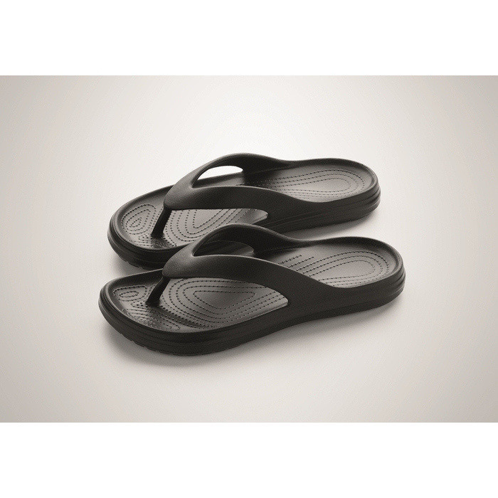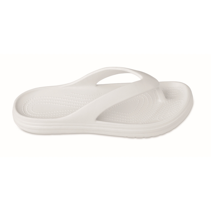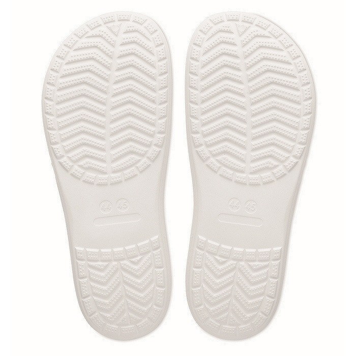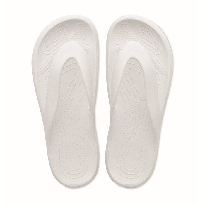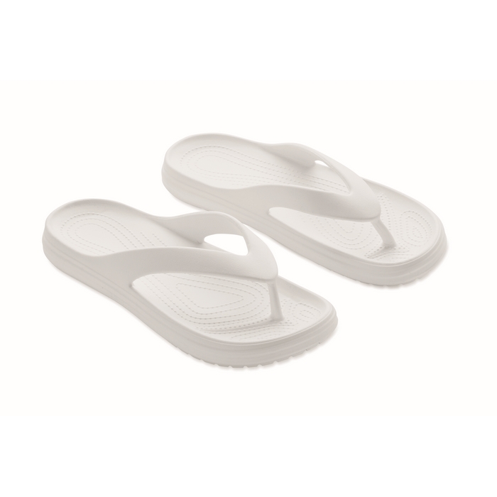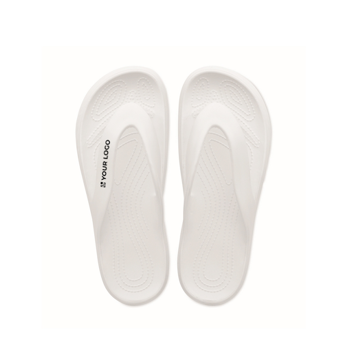 Strand-Slipper aus EVA in verschiedenen Größen, konzipiert für den gelegentlichen Einsatz in sommerlichen Umgebungen und bei Outdoor-Aktivitäten. Das Material sorgt für Leichtigkeit und ein angenehmes Tragegefühl, ideal für kurze Wege in Pools, Spas oder Ruhebereichen. Das schlichte Design erleichtert die Ausgabe in Willkommenspaketen oder als Ergänzung bei Werbeaktionen. In einer bestimmten Größe erhältlich, um die Logistik bei zielgruppenspezifischen Kampagnen zu vereinfachen. Empfohlen für Firmenevents, Hotels oder Markenaktivierungen in der Sommersaison.