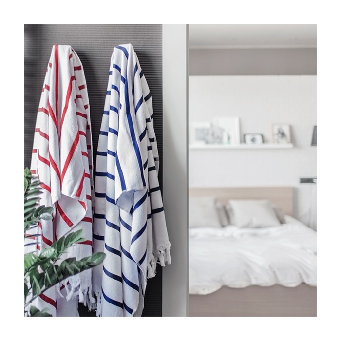 Pareo-Strandtuch aus Stoff mit 2 Seiten, eine aus Baumwolle und die andere mit einer leichten Kräuselung. Ein neues Stoffkonzept, dessen Haptik und Weichheit Sie bei der Verwendung schätzen werden.