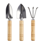 Gartenwerkzeugsatz aus Holz, bestehend aus zwei verschiedenen Schaufeln und einer Egge. Die Werkzeuge sind aus Edelstahl, die Griffe aus Holz. Einzeln verpackt in Baumwolltasche mit Zugband.