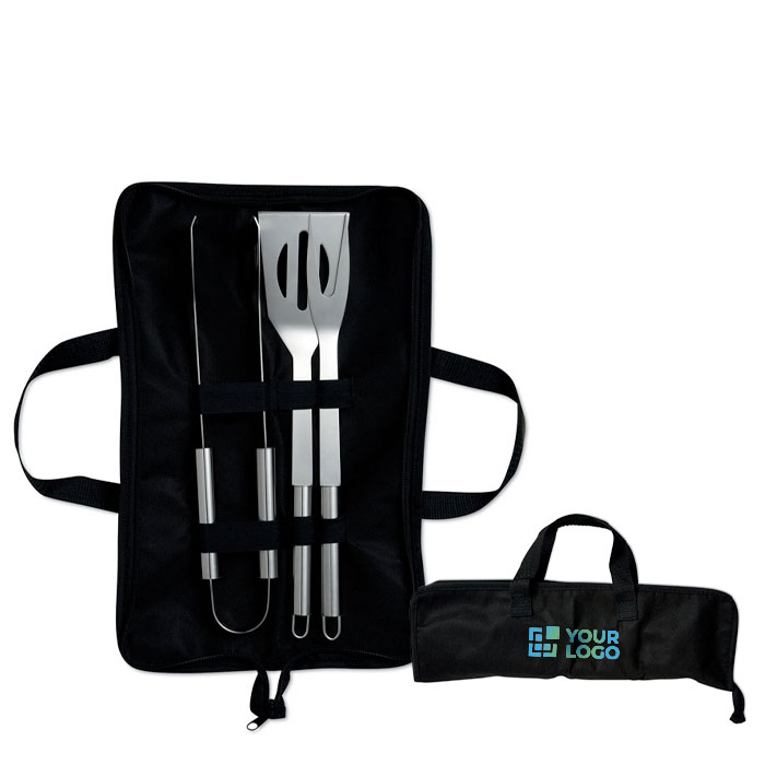 Werkzeugset für den Grill, das sich durch Eleganz und Praktikabilität auszeichnet. Dieses 3-teilige Set, bestehend aus Zange, Spatel und Gabel, ist aus rostfreiem Stahl gefertigt und garantiert Langlebigkeit. Die Non-Woven-Hülle mit Reißverschluss erleichtert nicht nur den Transport, sondern macht die Utensilien auch leicht zugänglich. Personalisieren Sie dieses Geschenk auf der Hülle oder auf einem der Zubehörteile. Außerdem können Sie mit unserem Expressversand sicherstellen, dass Ihre Geschenke rechtzeitig zu jedem besonderen Anlass ankommen. Verbessern Sie das Erlebnis Ihrer Kunden und fördern Sie Ihre Marke.
