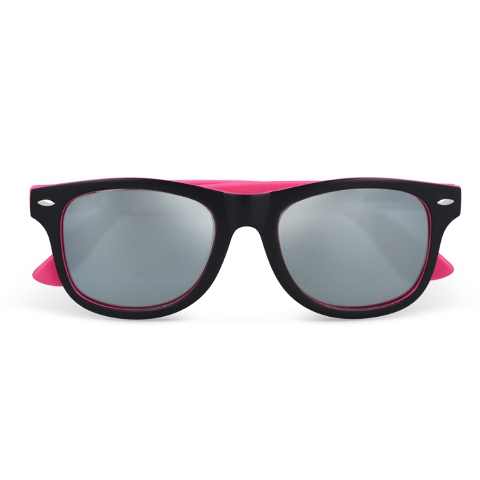 Sonnenbrille mit zweifarbiger Fassung und verspiegelten Gläsern mit UV400 Schutz. Setzt optische Akzente und stärkt das Markenimage bei jedem Event.