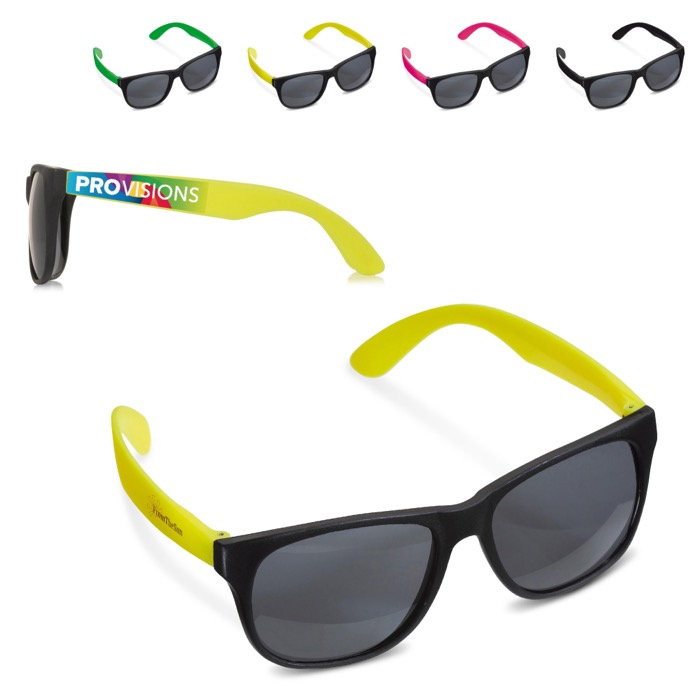Moderne Sonnenbrille mit farbigen Bügeln und einem UV400-Filter. Hervorragende Wahl für ein günstiges Werbegeschenk! Druck auf einem oder beiden Bügeln möglich.