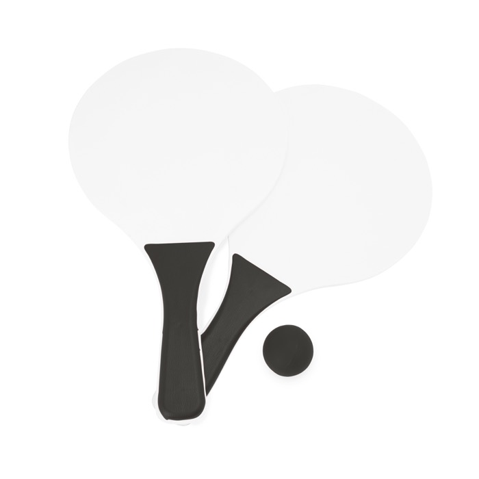 - Besteht aus 2 Schlägern aus MDF-Holz und 1 Ball
