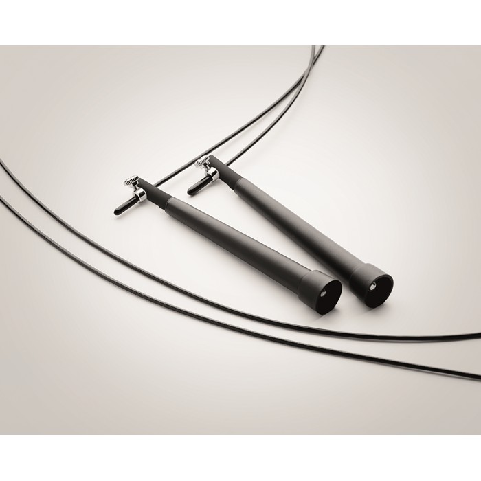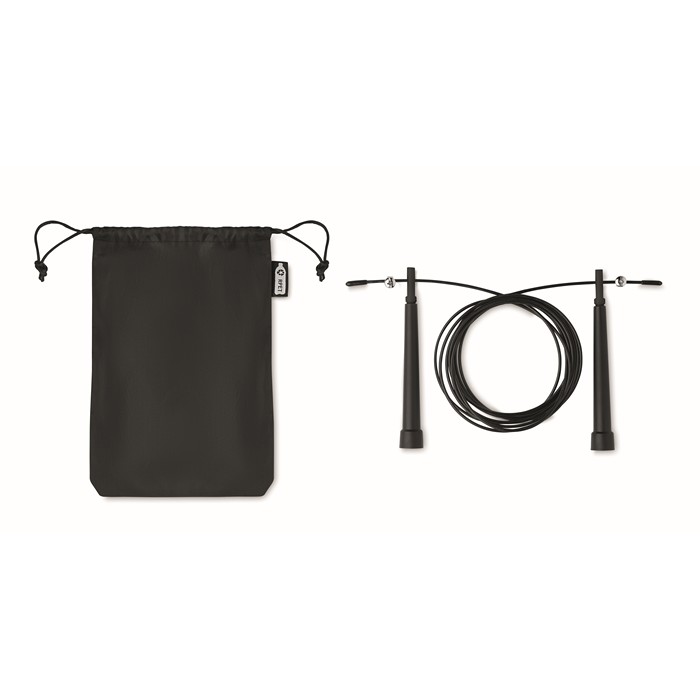 Schnelldrehendes Springseil mit verstellbarer Länge. Seil aus Stahl mit PVC Beschichtung. Lieferung im 210D RPET Beutel.