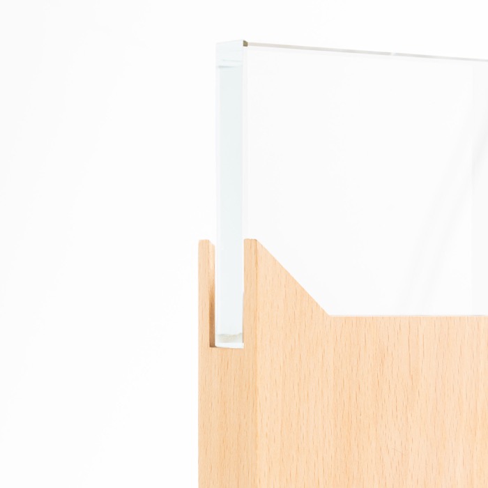 Glastrophäe mit Holzsockel, die aufgrund ihres Designs auch als Gedenktafel dienen kann. Ein Detail, das Sie mit Ihrem Firmenlogo bedrucken können.