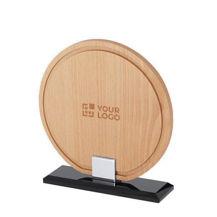 Runde Trophäenplakette aus Holz mit Glassockel, gedacht für Auszeichnungen und Unternehmensübergaben. Das silberfarbene Metallteil verbindet beide Elemente und sorgt für eine gepflegte Präsentation auf Tischen, in Vitrinen oder im Empfangsbereich. Das runde Design bietet eine klare Fläche zur Personalisierung mit Namen, Logos oder Dankesbotschaften. Dank des Formats fügt sie sich in verschiedene professionelle Umgebungen ein, ohne den Raum zu überladen. Eine praktische Option für interne Preisverleihungen, Unternehmensveranstaltungen oder Kundenbindungsaktionen.